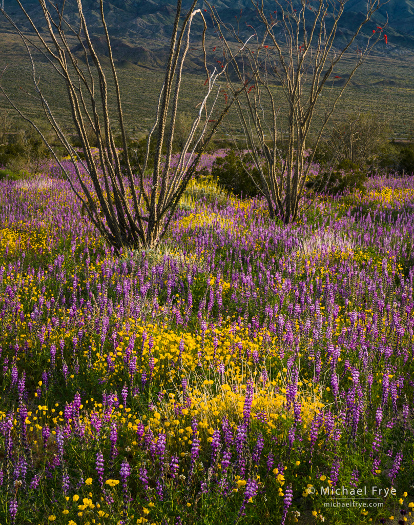 Ocotillos with desert poppies and lupines, Joshua Tree NP, California. 90mm, 1/20th of a second at f/16, ISO 100, polarizer, focus-stacked.