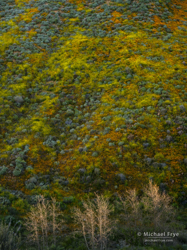 Poppies, mustard, and sycamores, Walker Canyon, California. 50mm, 1/6th of a second at f/11, ISO 100, polarizer.