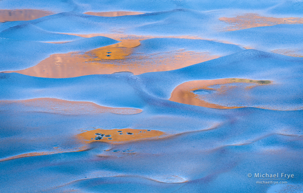 Melting ice and sunset reflections, Yosemite. 200mm, 3 seconds at f/16, ISO 100, focus-stacked and blended with Helicon Focus.