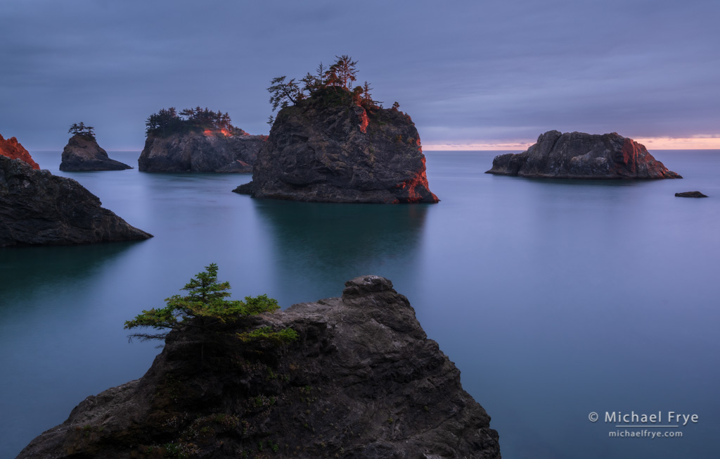 Spruce-covered sea stacks at sunset, Oregon coast. 34mm, 15 seconds at f/16, ISO 100, 7-stop ND filter.