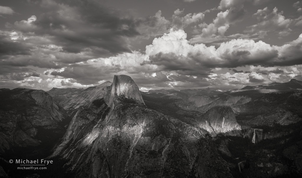 At Glacier Point I watched a continuous parade of clouds march by from south to north, presenting a series of beautiful cloudscapes over Half Dome and Nevada Fall. For most of that time Half Dome remained dark, shaded by clouds to the west, but on a couple of occasions the sun broke through, adding a key focal point to the compositions.