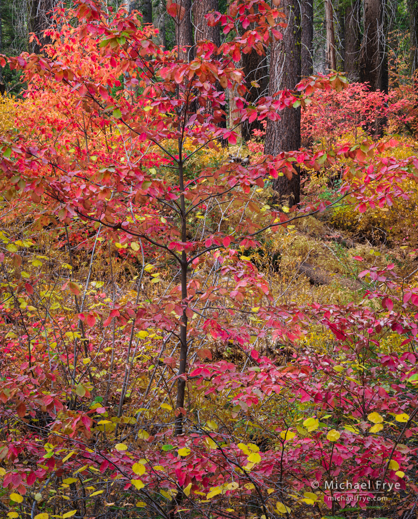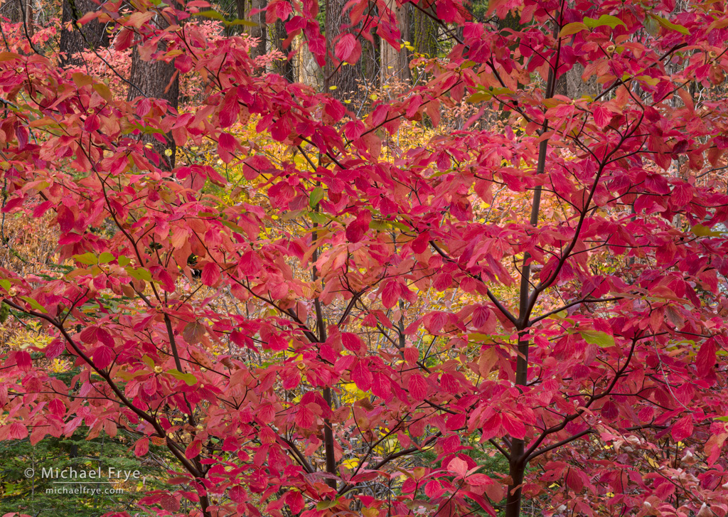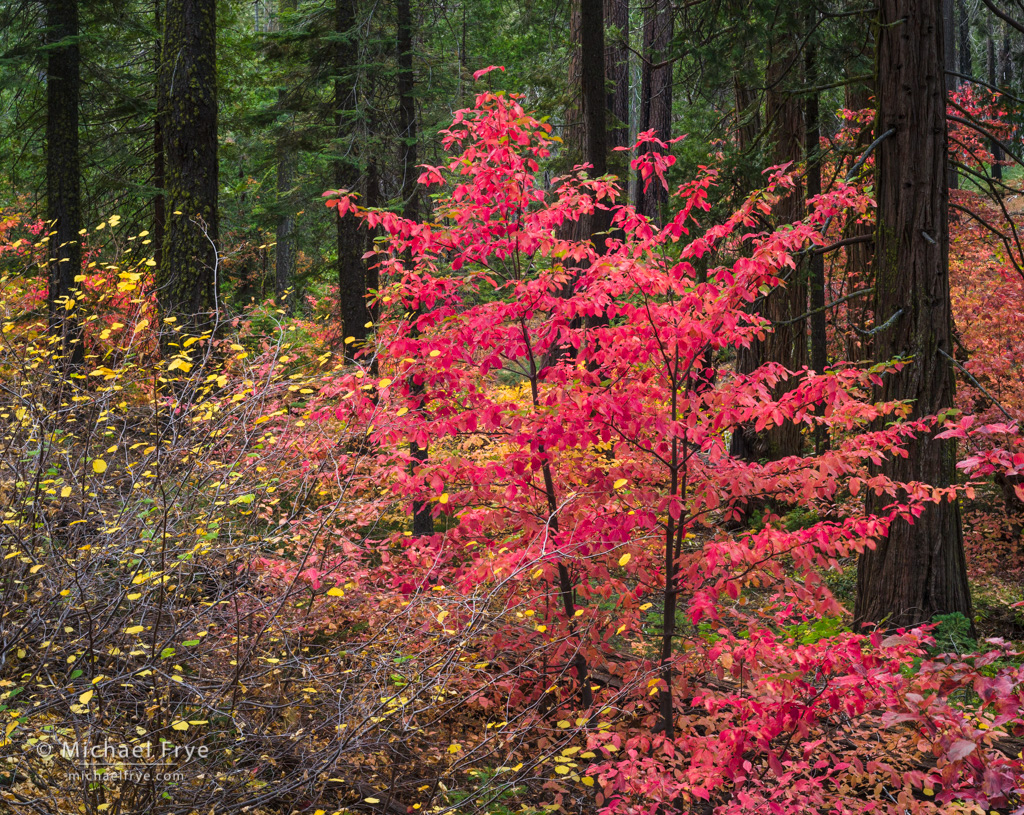 Recently Claudia and I were photographing a colorful patch of dogwoods near Highway 120, above Yosemite Valley. I’ve included four images here from that afternoon. Which is your favorite?