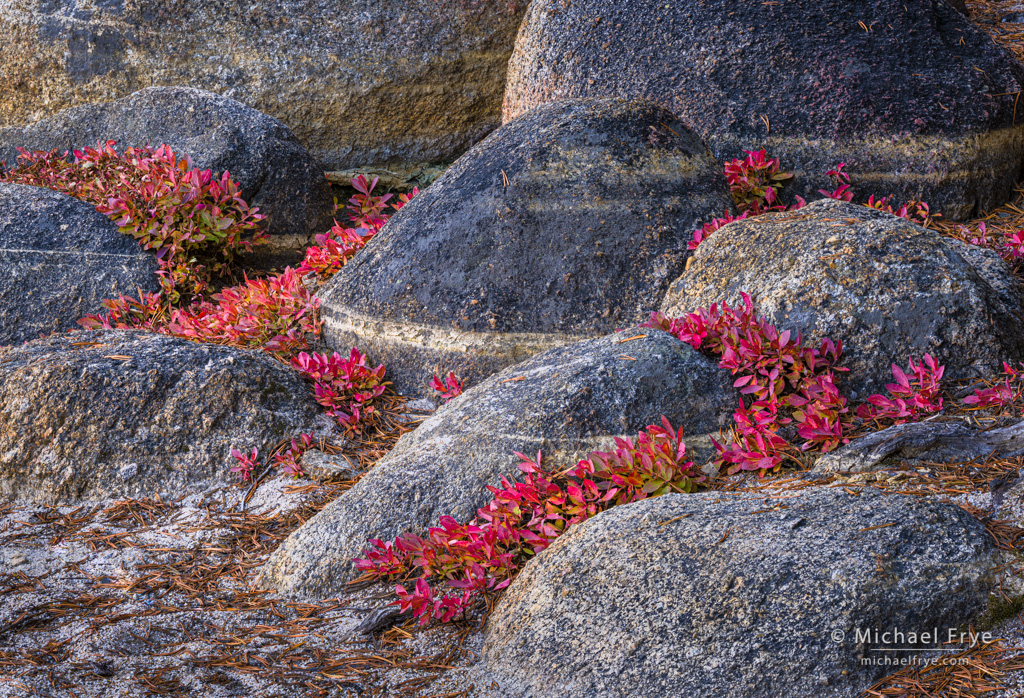 Blueberry leaves and granite boulders, Yosemite. I made this image during our Eastern Sierra workshop last month. One afternoon we drove up to the Yosemite high country, where some red blueberry bushes near the shore of a lake caught my eye. Good compositions eluded me at first, but I kept looking, and eventually found this pattern of red leaves and rounded boulders. 135mm, 1/2 sec. at f/16, ISO 100, focus stacked.