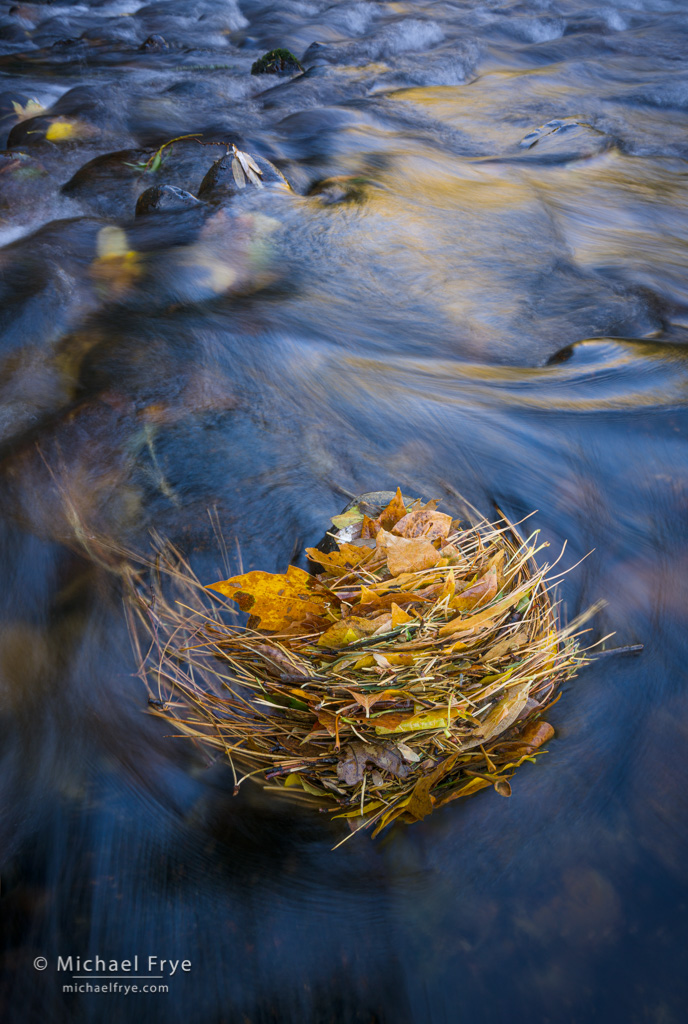 Leaf stack in the Merced River, Yosemite. Some colorful cottonwood trees caught my attention and drew me to this stretch of the river. I couldn’t find a good composition for the cottonwoods, but noticed these maple and cottonwood leaves stacked against a rock above a small rapid. I was wearing chest waders, since I knew I might need to go in the river, so I waded carefully out to the rapid. The leaf stack provided a nice focal point, which I then juxtaposed with the gold reflections. To keep the composition simple and clean I got close to the leaf stack with a wide-angle lens (20mm), and pointed the camera down to eliminate the riverbank, which was just above the top of the frame, and full of messy, cluttered branches. 1/2 sec. at f/16, ISO 100.
