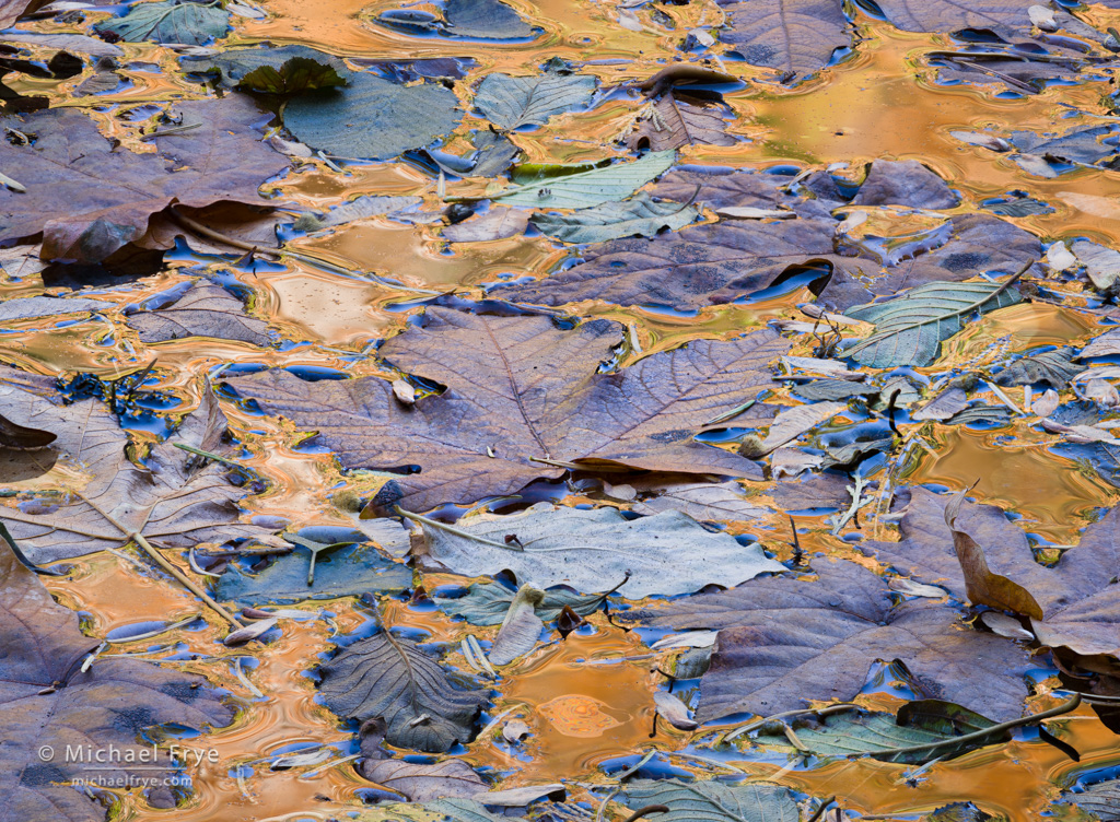 Leaves and reflections in the Merced River, Yosemite. I made this image just upstream from the leaf-stack photo. My attention was caught by gold reflections in the water, from sunlight hitting an oak tree across the river. What could I do with that? I saw some maple and alder leaves in a pool near the edge of the river, so I found a way to climb down the steep bank, got down low to get the right angle for the reflection, and found this composition, with a large maple leaf providing a focal point. 200mm, 1/3 sec. at f/16, ISO 100, focus stacked.