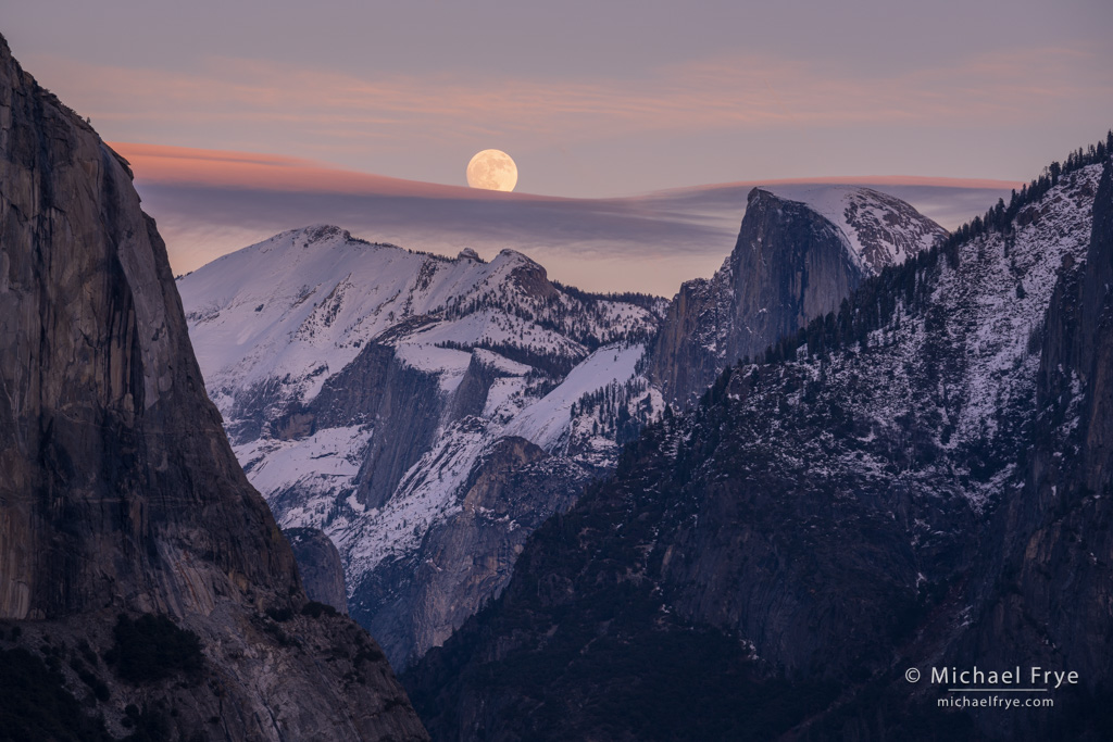 Moon rising above Half Dome and Cloud’s Rest, Yosemite. We planned to photograph this moonrise, but the band of lenticular clouds added a nice touch. 180mm, 1/20th sec. at f/11, ISO 100.