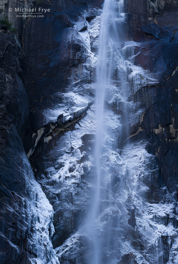 Ice, reflections, and cascade, Yosemite. 140mm, 1/6 sec. at f/16, ISO 320. I blended four focus-stacked images by hand in Photoshop using layer masks.