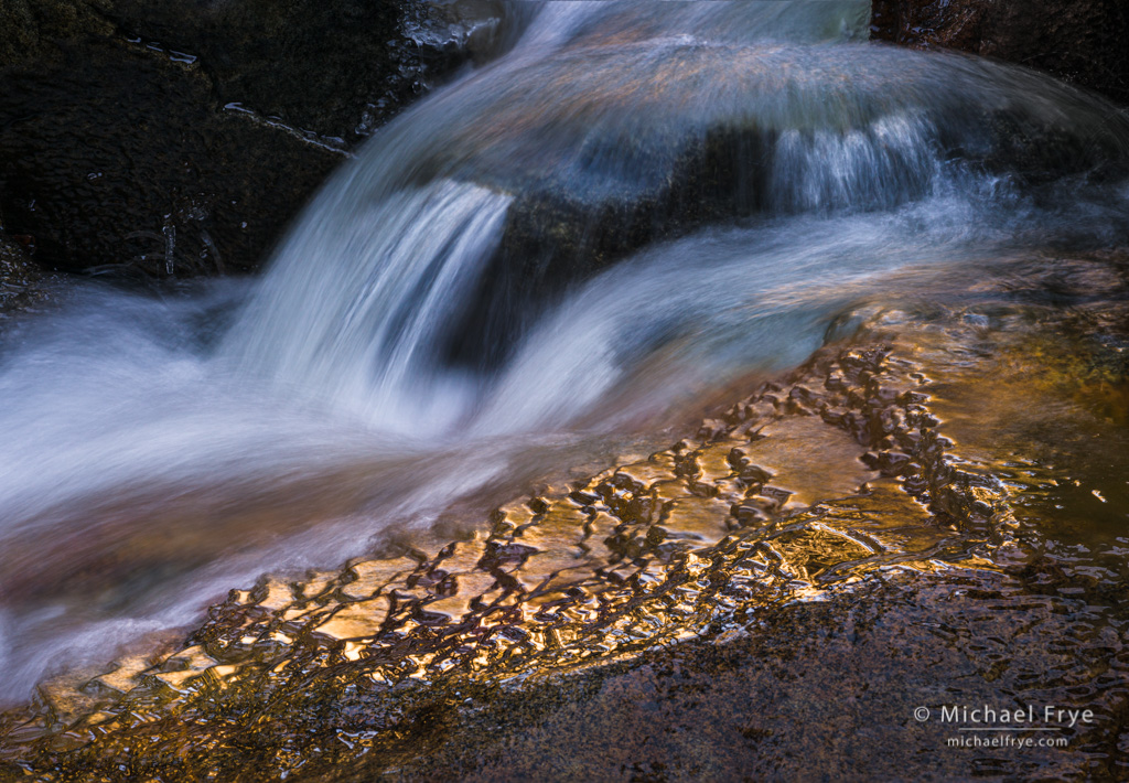 Ice and reflections, Yosemite. The gold color comes from reflections of sunlit cliffs, while I used a polarizing filter to bring out the prism effects in the ice. 168mm, 3 seconds at f/16, ISO 320; focus-stacked and blended with Helicon Focus.