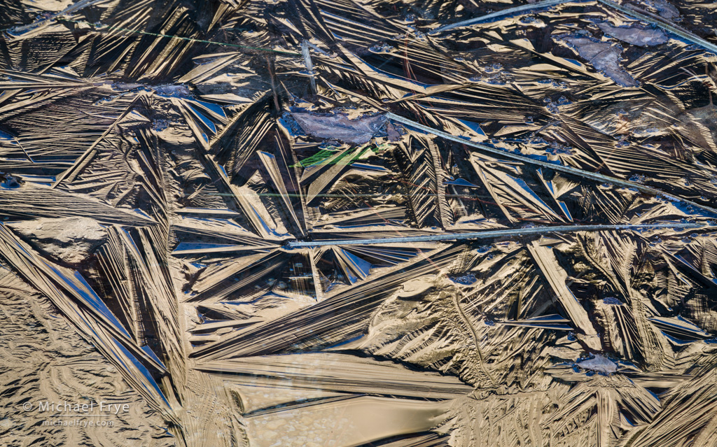 Ice patterns, Yosemite. Looking for interesting light might require finding just the right angle to see gold and blue reflections in ice.