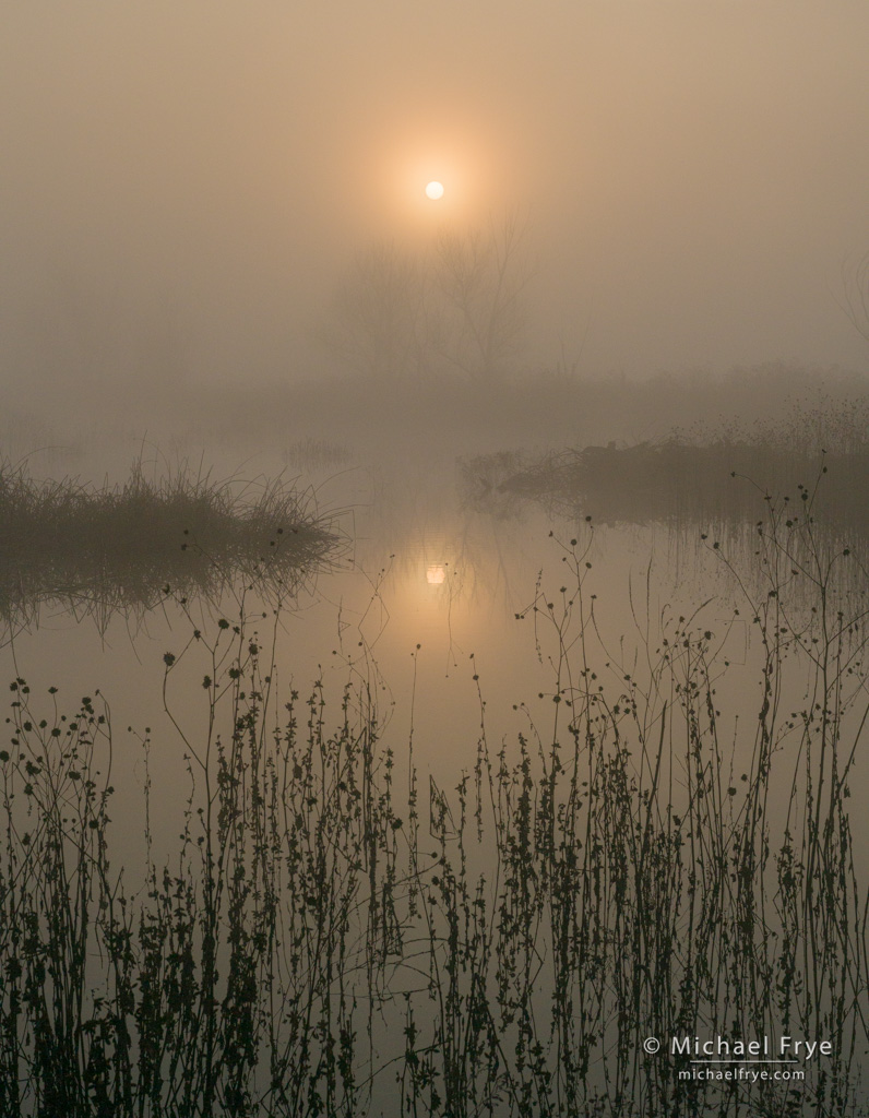 Foggy sunrise, San Joaquin Valley. A marsh might not be most people’s idea of a spectacular landscape, but can look spectacular when the sun rises through the fog.