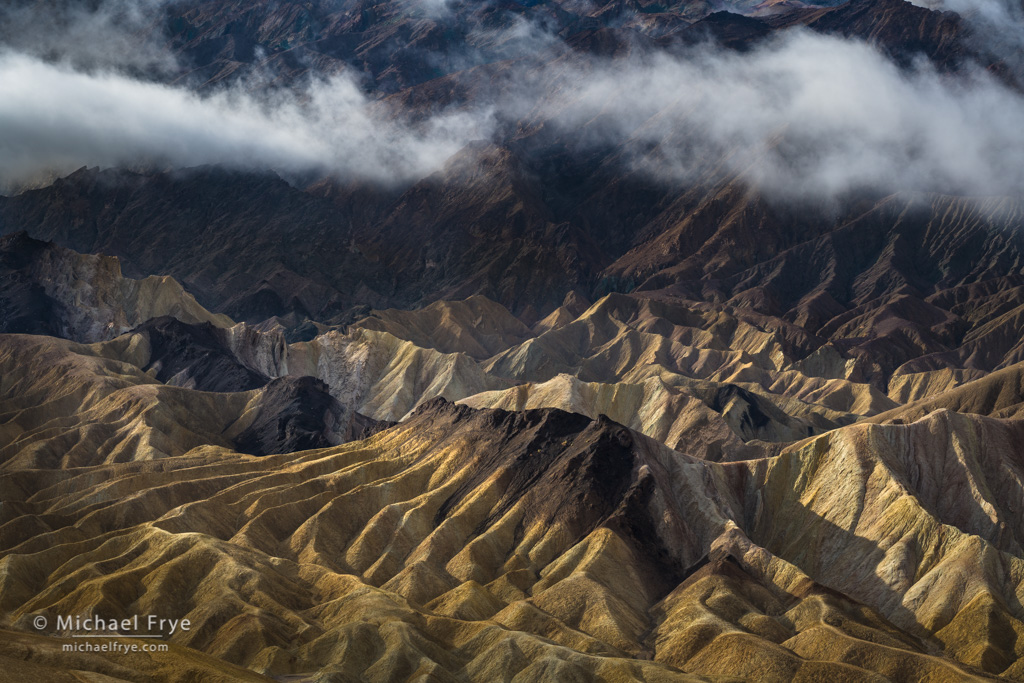 I ended up near a few other photographers, including Erin Babnik’s workshop group, and we all endured wind-driven rain showers while photographing misty scenes of the badlands. Mist isn’t something you expect in Death Valley, but there it was. I felt like I was at Tunnel View in Yosemite, waiting for a storm to clear, except the landscape below was rather different.