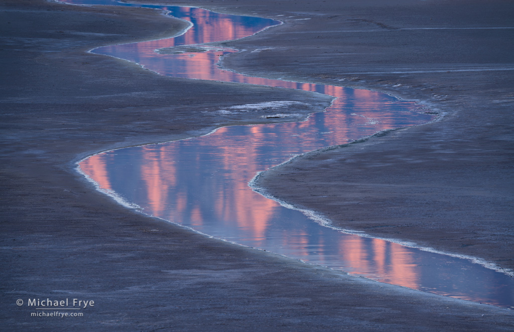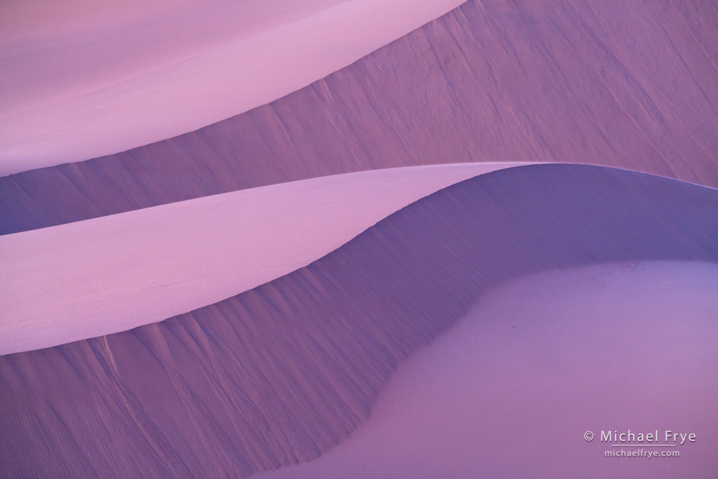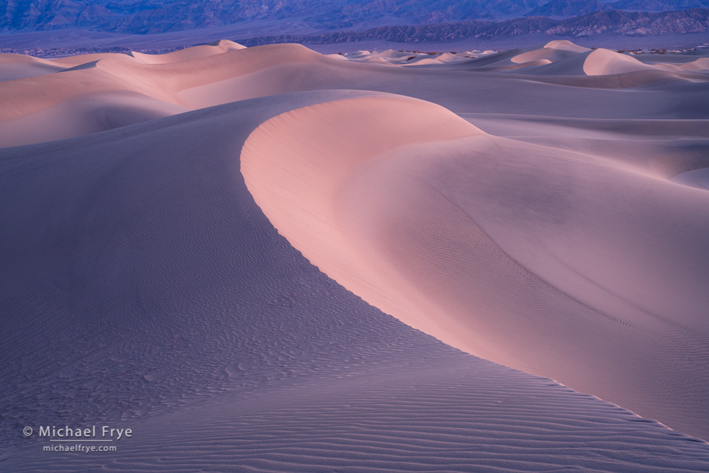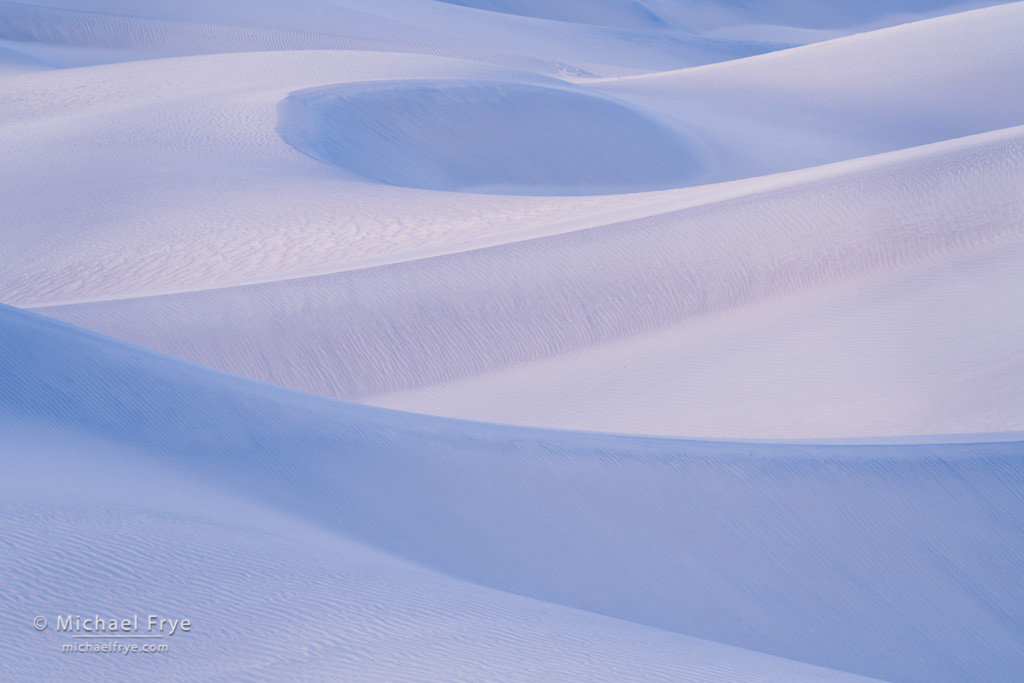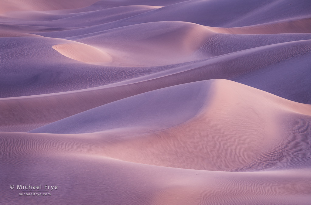But on our last visits to Death Valley, at the end of February and beginning of March, I realized that my tastes have evolved, and I actually prefer photographing the dunes in soft light, before the sun reaches them in the morning, or after the sun leaves them in the evening. At dawn and dusk the dunes can reflect beautiful colors from the sky, turning gold, blue, pink, or even purple. But also, and perhaps more importantly, they look softer. Under that light the dunes look like big, fluffy pillows of sand. They’re less harsh, and more inviting.
