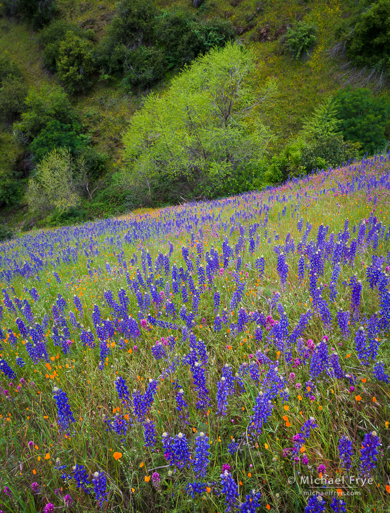 From there, having figured out more-or-less where to place the patch of yellow, I had to arrange the top part of the picture in a way that created left-to-right balance. I noticed a subtle, bow-shaped arrangement of the blue lupines up there, along with another patch of yellow. So I walked back and forth, left and right, in order to line up the patch of yellow below center with the bow-shaped swath of lupines near the top.