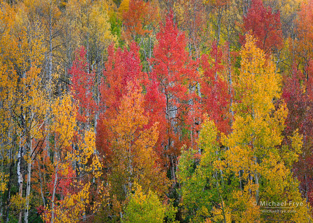 Aspen kaleidoscope, Uncompahgre NF, Colorado. Soft light helps to visually simplify busy forest scenes, and bring out color contrasts. The center-right clump of red trees here provided a focal point, and there were several unifying patterns: the flame-like tree tops, the repeating vertical lines of the trunks, and the multi-colored polka dots of the leaves. A small clearing next to a road allowed me step back, use a long lens, and find the patterns. 106mm, polarizer, 1/4 sec. at f/16, ISO 400.