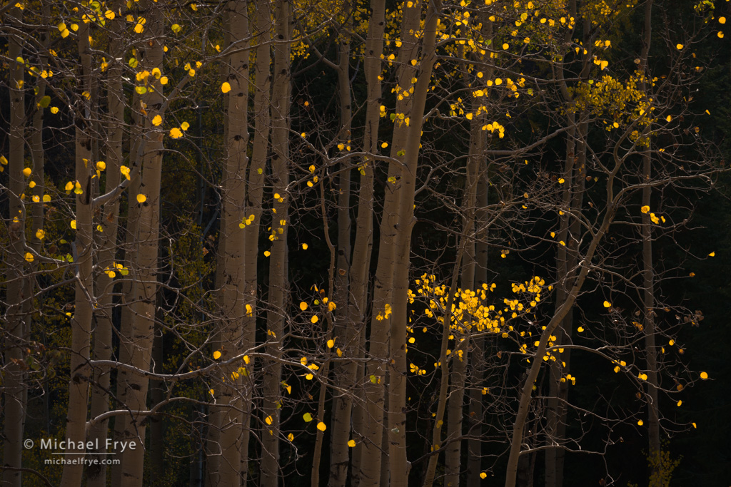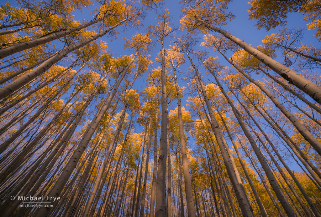 Aspen canopy, Colorado. We found a beautiful roadside grove, with a carpet of aspen leaves on the forest floor, and understory firs decorated with yellow leaves. I called it the Enchanted Forest. As we explored further, I saw some tall aspens catching the last light of the day, and found this symmetrical composition. This scene is actually frontlit; every other image here is backlit. 16mm, 1/125th sec. at f/11, ISO 200.