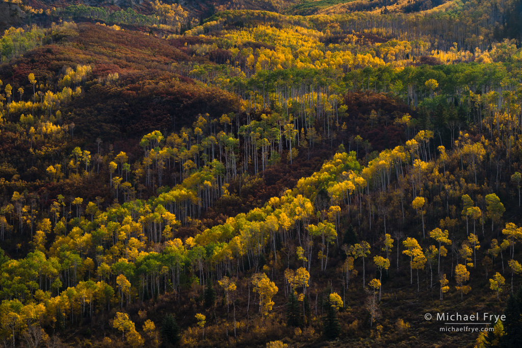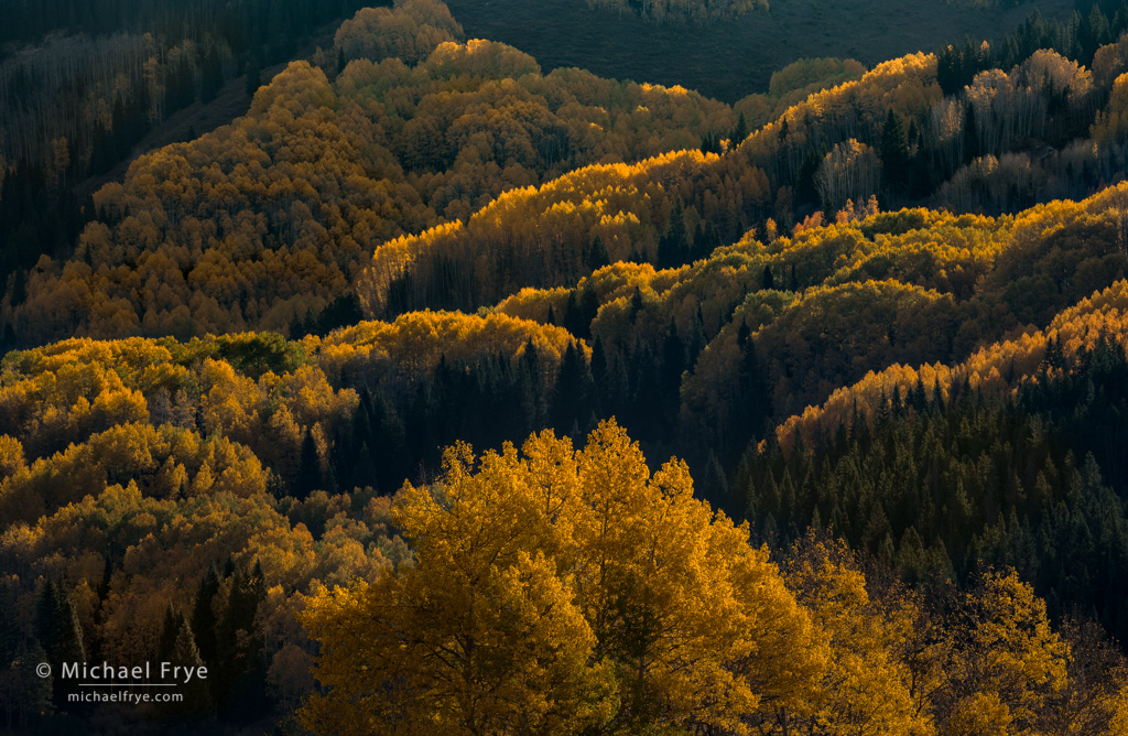 Aspen-covered hillsides, Colorado. After photographing inside some backlit aspen groves, I climbed back up to where we were parked and noticed the light catching the tops of the aspens across the valley. 154mm, 1/45th sec. at f/16, ISO 100.