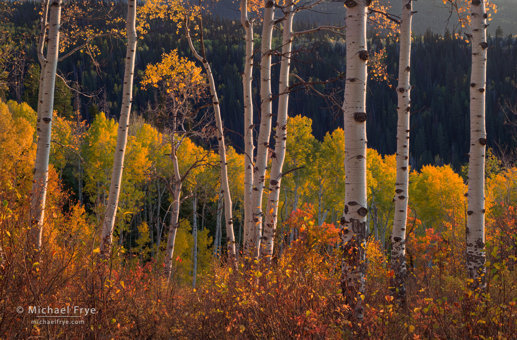 I almost always looked for situations where a grove would be backlit. Sometimes I’ll find a scene where sidelight or frontlight will work, but backlight shining through translucent aspen leaves is pretty special.