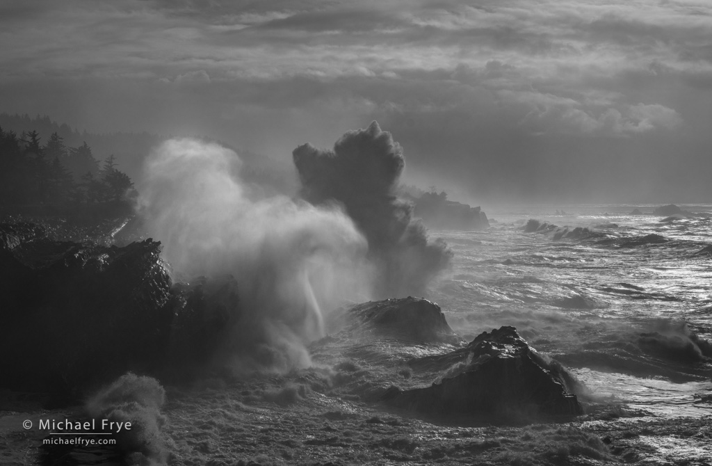 Crashing wave, Oregon Coast. To get a sense of scale, click on the image to view it larger and see if you can spot the person in the frame. He’s just to the left of the wave between some trees. It looks like the wave would have soaked this photographer, but it probably didn’t; the wave is actually between that person and the camera, and the spot he was standing on usually stays dry. This wasn’t the tallest splash we saw that day, but the light at that moment, along with the shape of the wave, made this image the clear winner in my mind. 50mm, 1/500th of a second at f/11, ISO 160.
