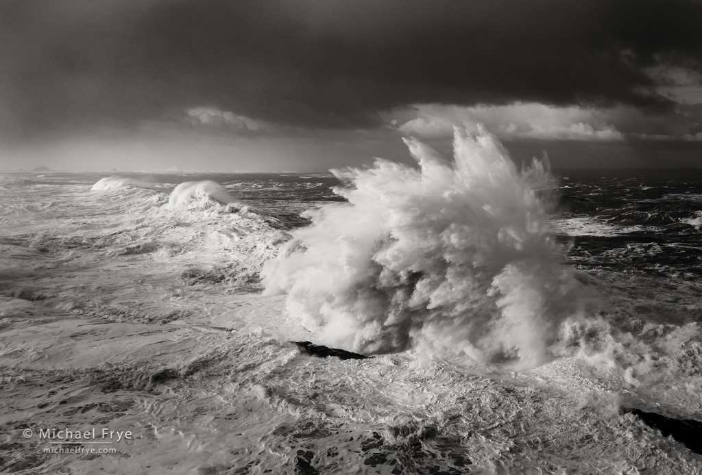 I tried to keep my shutter speed up to at least 1/250th of a second to freeze the motion of the water, and used a pretty wide lens (50mm). Previous experience had shown me that with a longer lens the very biggest wave splashes could go off the top of the frame, so I reasoned that it was better to use a wider lens, and crop if necessary, than to cut off the top of the wave.