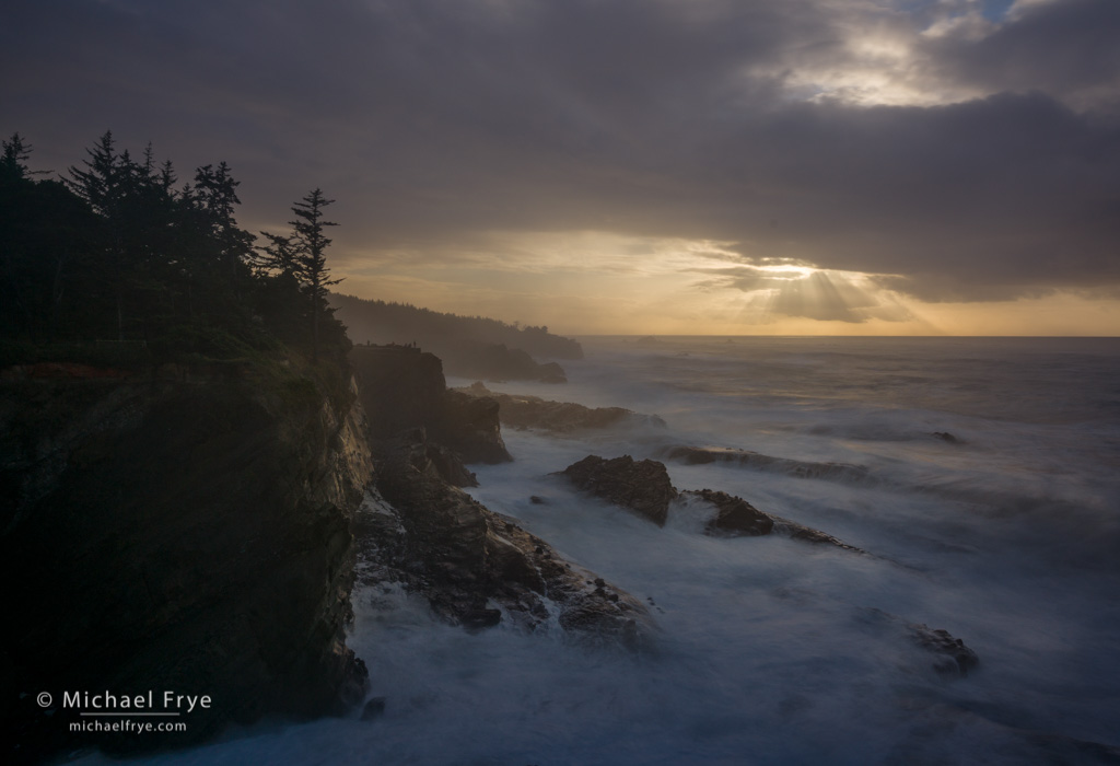 Crashing wave, Oregon Coast. To get a sense of scale, click on the image to view it larger and see if you can spot the person in the frame. He’s just to the left of the wave between some trees. It looks like the wave would have soaked this photographer, but it probably didn’t; the wave is actually between that person and the camera, and the spot he was standing on usually stays dry. This wasn’t the tallest splash we saw that day, but the light at that moment, along with the shape of the wave, made this image the clear winner in my mind. 50mm, 1/500th of a second at f/11, ISO 160.