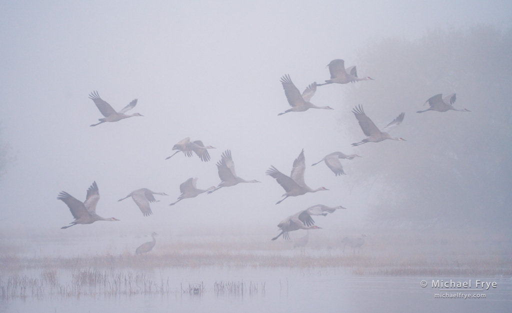 Sandhill cranes taking flight, San Joaquin Valley, California. 291mm, 1/500 sec. at f/5.6, ISO 2000.