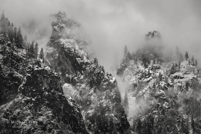 Thursday afternoon brought snow showers to the Sierra. I knew this kind of showery weather might include breaks where sunlight could filter through the clouds, and it also looked like skies might clear around sunset, so I thought it might be worth heading up to Yosemite Valley.