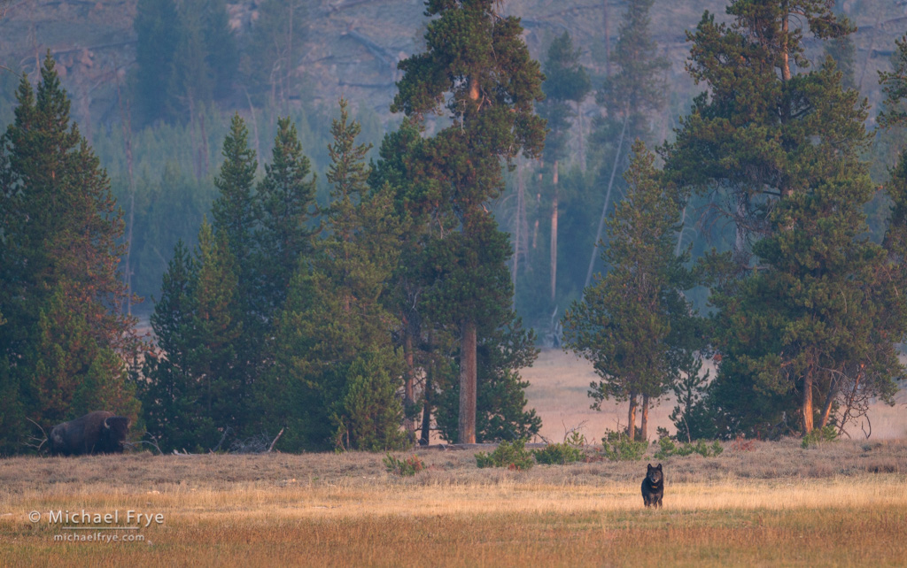 By itself, I like the photograph of the sunrise by the river much better. And that also evokes similar memories, because I know what happened right after I took it. And by the same token, my nighttime photograph Grand Prismatic Spring reminds me of my first encounter, in the dark, with two wolves (well they were probably wolves anyway).
