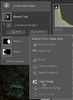 But if you subtract the Color (or Luminance) Range mask, then check the Invert box, that will work (instead of subtracting out the color, you invert that selection and add it in). Better yet (and easier to wrap your head around – at least for me), instead of choosing Subtract, hold down the Option or Alt key, which replaces the Add and Subtract buttons with an Intersect button: