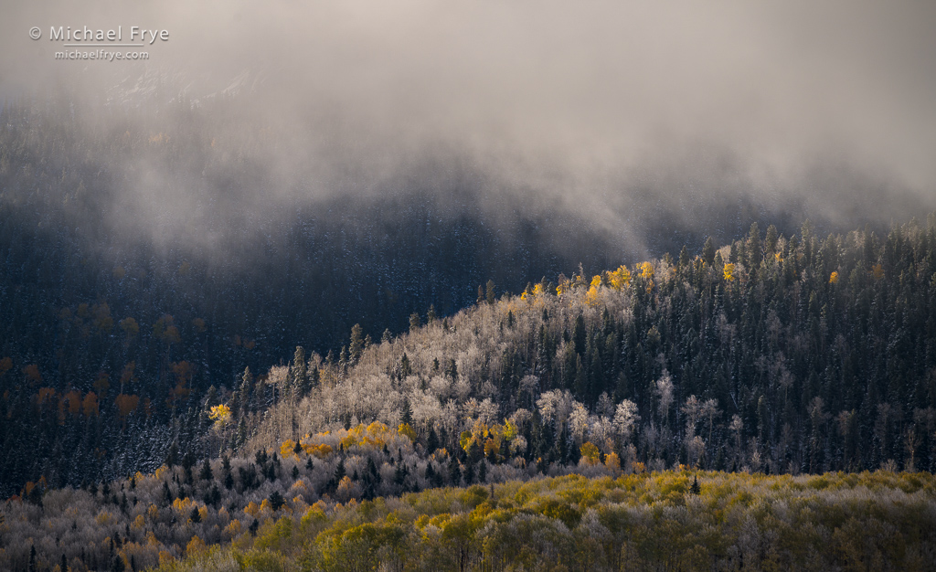 We arrived in Colorado later than usual – on October 9th. Often the fall color is on its last legs by then, but this year we found lots of aspens that still had yellow and orange leaves – and even some green ones. And forecasts called for several snowstorms over the next week, with relatively low snow levels. It seemed like a perfect setup for catching colorful aspens draped with snow.