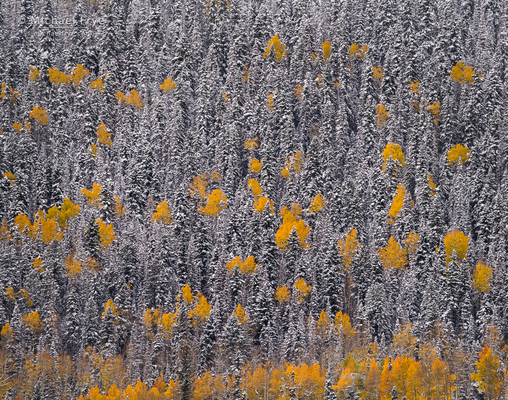 We arrived in Colorado later than usual – on October 9th. Often the fall color is on its last legs by then, but this year we found lots of aspens that still had yellow and orange leaves – and even some green ones. And forecasts called for several snowstorms over the next week, with relatively low snow levels. It seemed like a perfect setup for catching colorful aspens draped with snow.