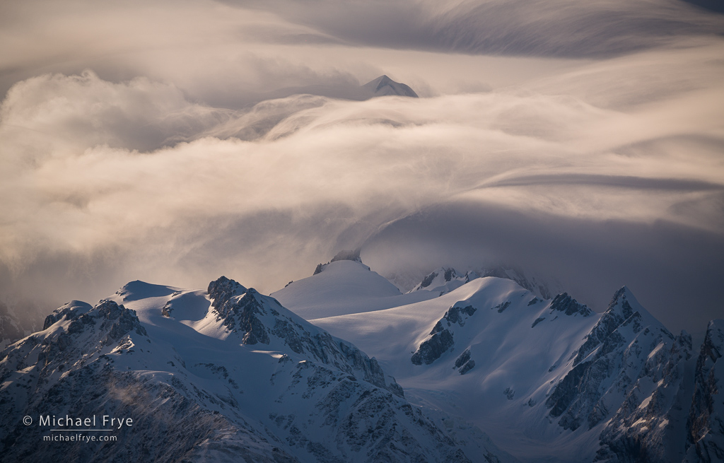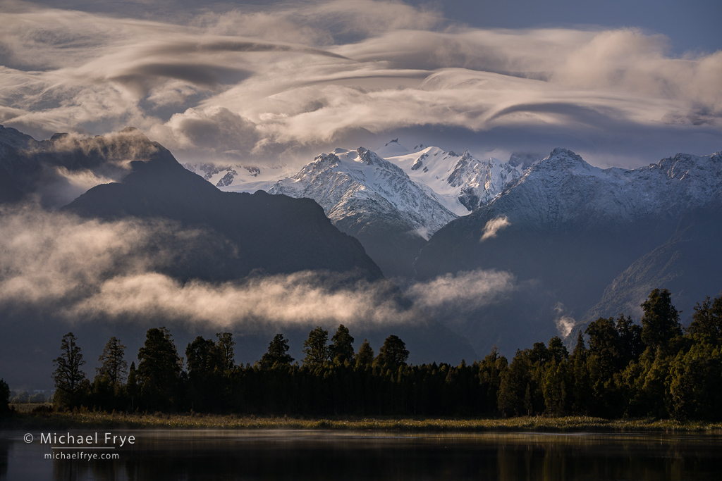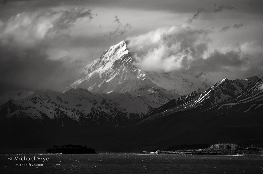 Of course the precipitation that creates those glaciers means that the mountains can disappear into clouds for long periods of time. But as we traveled around the island, guided by my co-instructor Phillip Bartlett, and accompanied by our wonderful group of participants in this Visionary Wild workshop, we continued to have great conditions. We were lucky to not only see these mountains, but to have some beautiful light and clouds at times. I posted one photo of Aoraki / Mt. Cook previously, but here are a few more images of these amazing mountains.