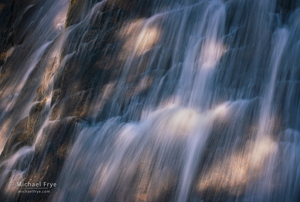 Dappled light on a waterfall, Sierra Nevada, California. I posted this photo after our pack trip into the Sierra backcountry this summer, but I’ve included it again here because it’s a good example of working with different kinds of light on waterfalls. Franka Gabler and I were heading back to camp after sunrise, and decided to check out this waterfall, where we found some beautiful, dappled light on one section of the fall. This kind of light can look harsh and awful, but here the spots of light had a nice, fairly-even pattern we thought could work. The light was, of course, shifting and changing as the sun moved, so I had to keep adapting my composition accordingly. I tried to find moments where the sun was hitting something interesting, like the little ledge just right of center in this photo, and also tried to avoid having bright spots touch the edge of the frame, where they would pull the eye out of the picture. (This is the composition I liked best; you can see one of Franka’s versions here.) Again, I had to experiment to find the right shutter speed, and settled, again, on 1/6 sec. I used a polarizer to cut glare and reflections on the wet rock, but can’t remember whether I used a neutral-density filter. 94mm, 1/6 sec. at f/16, ISO 100, polarizer.