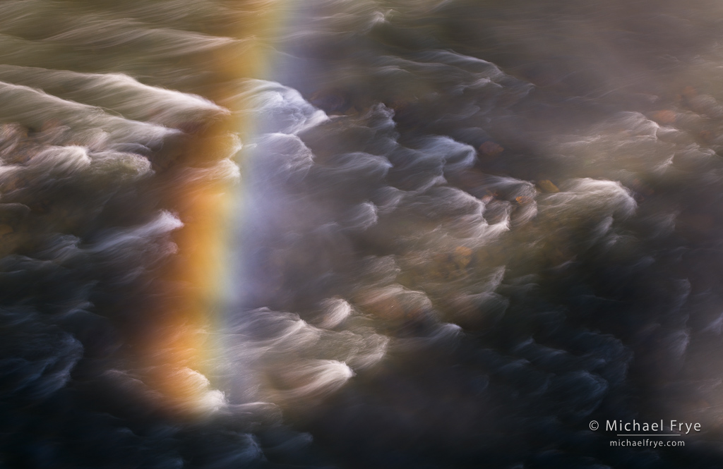 And of course waterfalls are quite photogenic. Over the past year I’ve had the opportunity to visit several waterfalls I’ve never photographed before. And while soft light usually works for waterfalls, I tried to seek out more unusual lighting conditions that could give the photographs a different look and feeling. That meant using sunlight, but waterfalls usually reside in basins and canyons, so they don’t often get that warm, low-angle light that we’re often looking for. And when the sun does get high enough to strike the fall, it’s often filtered through trees, creating splotchy light. Splotchy light can be harsh and downright awful, but sometimes, under the right circumstances, it can work. And – again, under the right circumstances – backlight can highlight a waterfall’s spray. And while front light is usually flat and boring, with waterfalls it can create rainbows.