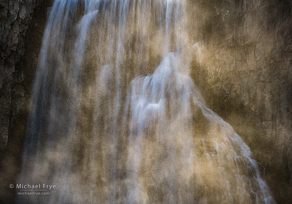 Waterfall with backlit spray, Sierra Nevada, California. Claudia and I hiked to this waterfall early in the morning, and the light was so-so at first. But as the sun rose higher it backlit the spray kicking up from the base of the waterfall, creating beautiful amber-colored veils of mist in front of the fall. I experimented with different shutter speeds, eventually settling on 1/6 sec. to create some blurring and sense of motion, while preserving some of the texture of the spray. 81mm, 1/6 sec. at f/16, ISO 200, polarizer.