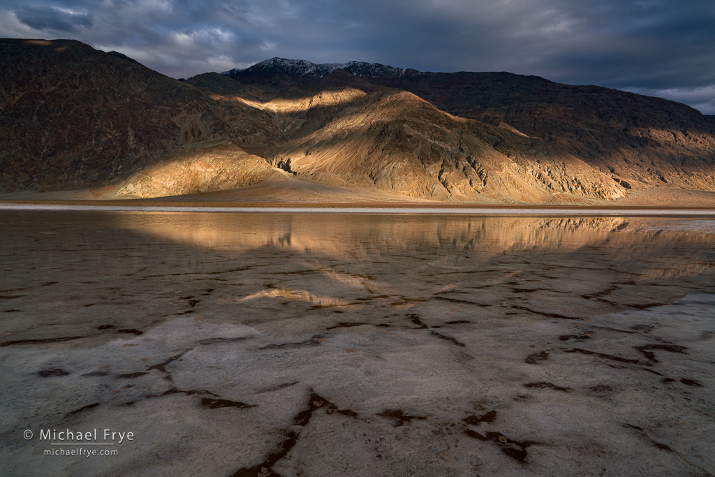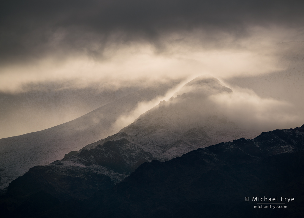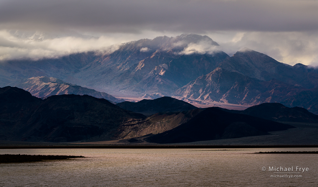 It turned into a great trip. Our first stop was Death Valley, where we got to experience an uncommon event for the driest place in North America: rain. We saw clouds, mist, salt flats filled with water, and lots of snow in the surrounding mountains, giving them an alpine look that you don’t often see. It was fun to experience and photograph, and I’ve included a selection of photos here from during and after the storm in Death Valley. I’ll post photos from the rest of our trip later.