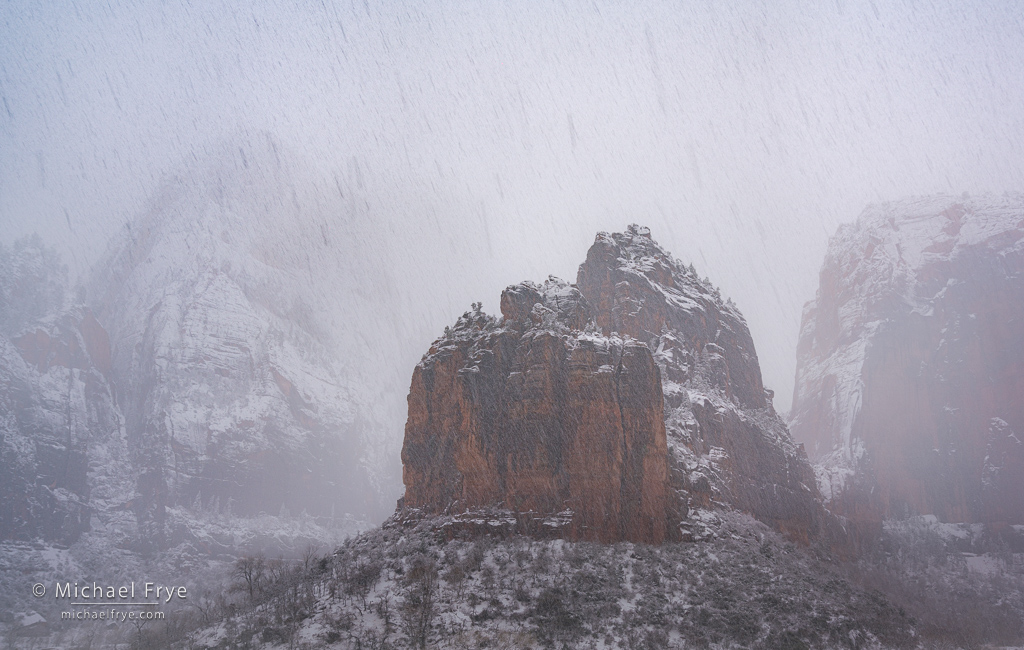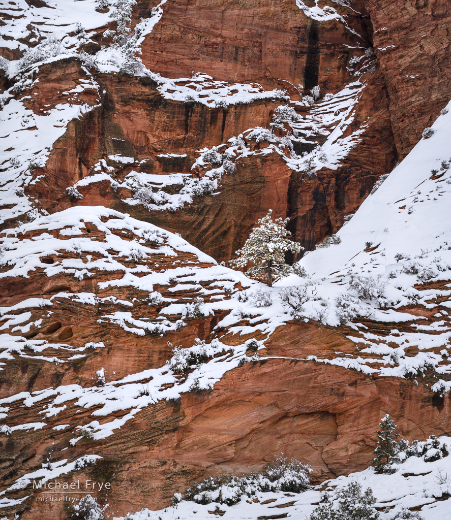 After escaping Mariposa’s snowmageddon, and spending a few days in Death Valley, Claudia and I decided to head for Zion. I’d never photographed Zion with snow, and snow was in the forecast. Well maybe. We drove there on a Monday, and it looked like some higher elevations could get a dusting of snow Monday night, followed by a more substantial storm, with colder temps, on Tuesday night. The question was whether it would be cold enough to snow on the floor of Zion Canyon. That seemed iffy, but odds were decent enough to make it worth trying.