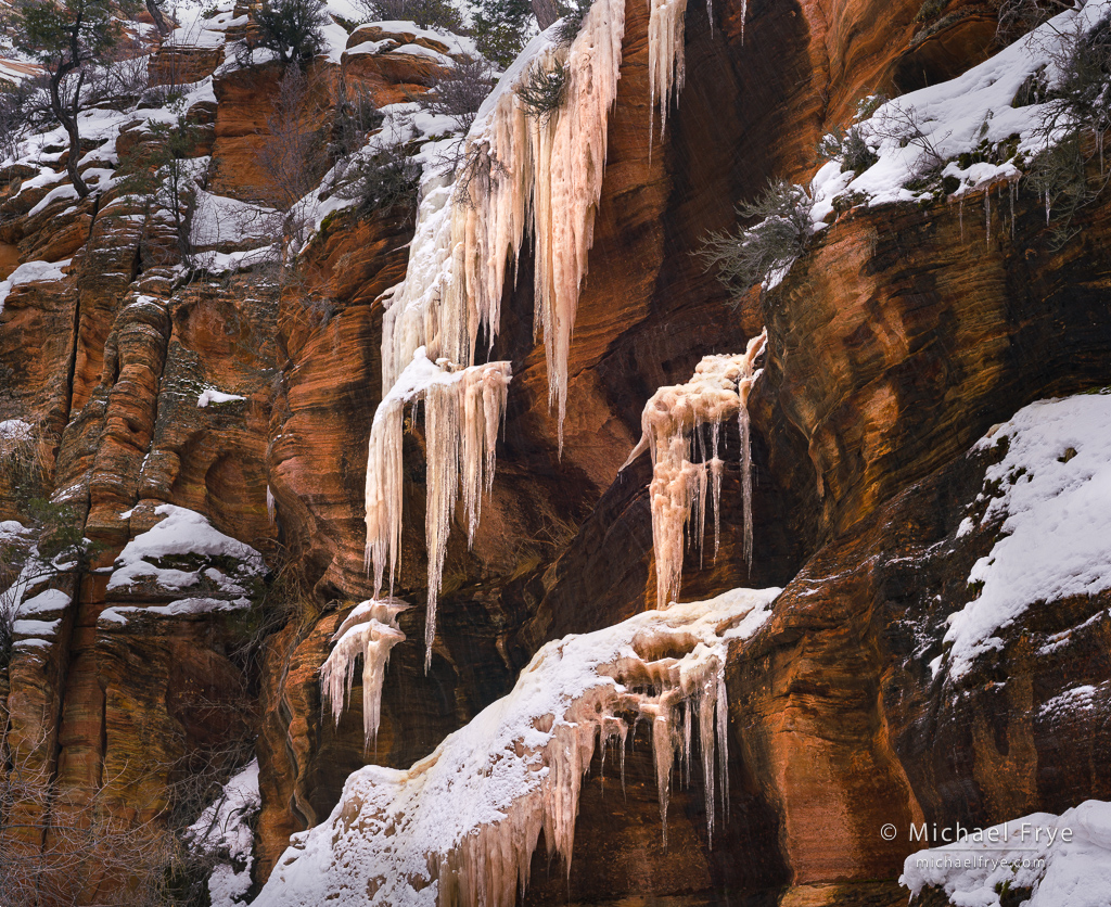 The next morning we didn’t find any snow in Zion Canyon, so we drove up through the tunnel to higher elevations, where we found a dusting of fresh snow etching the red rocks, and some beautiful, red-stained icicles.