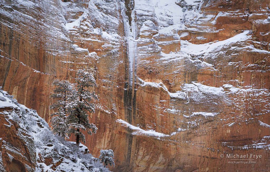 Pines, snow, sandstone, and ice, Zion NP, Utah