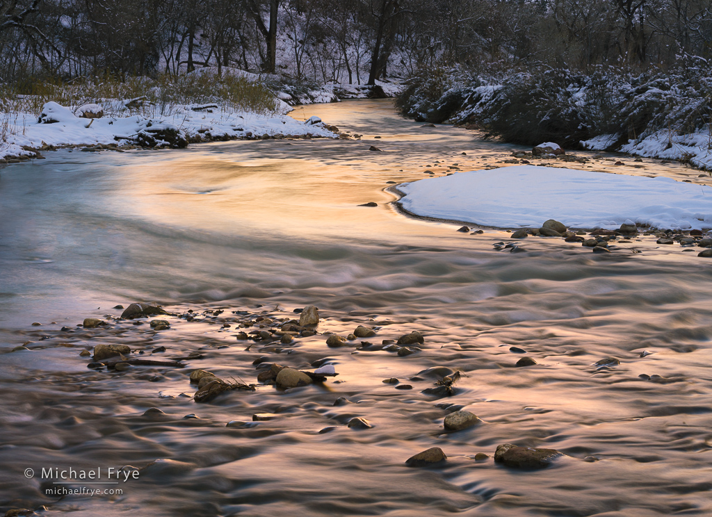Snow and reflections in the Virgin River, Zion NP, Utah