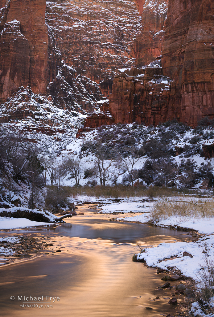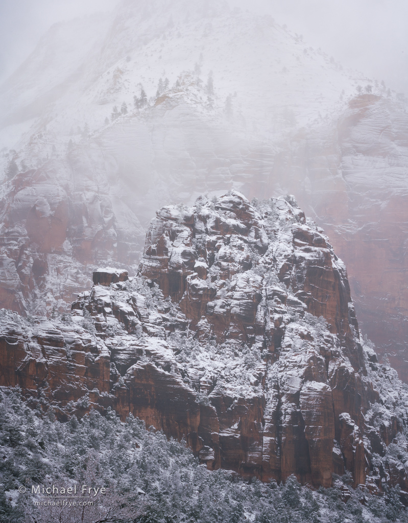 After escaping Mariposa’s snowmageddon, and spending a few days in Death Valley, Claudia and I decided to head for Zion. I’d never photographed Zion with snow, and snow was in the forecast. Well maybe. We drove there on a Monday, and it looked like some higher elevations could get a dusting of snow Monday night, followed by a more substantial storm, with colder temps, on Tuesday night. The question was whether it would be cold enough to snow on the floor of Zion Canyon. That seemed iffy, but odds were decent enough to make it worth trying.