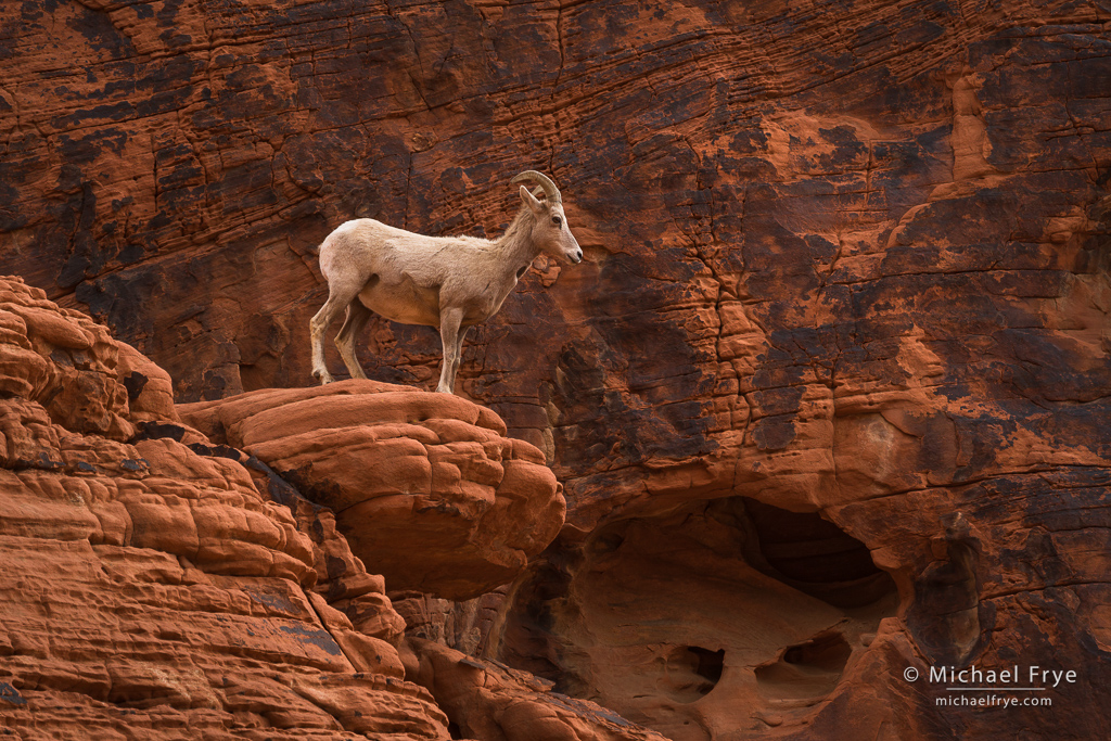 Bighorn sheep ewe perched on a sandstone outcrop, Valley of Fire SP, Nevada