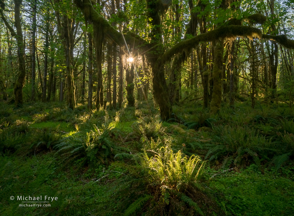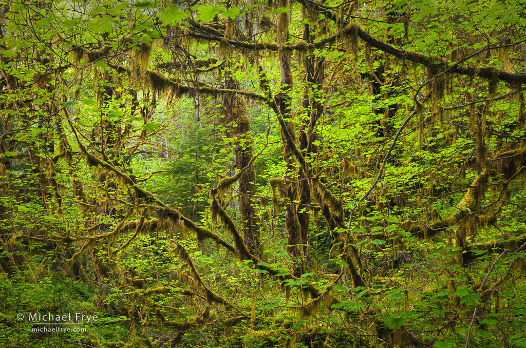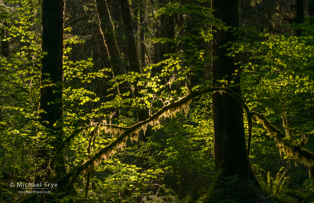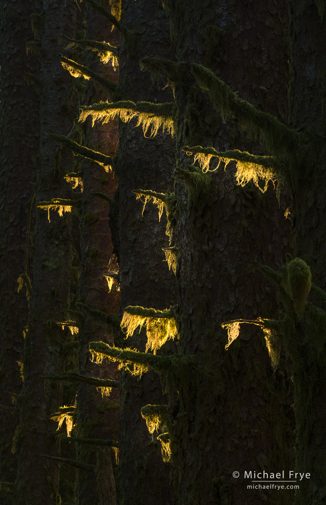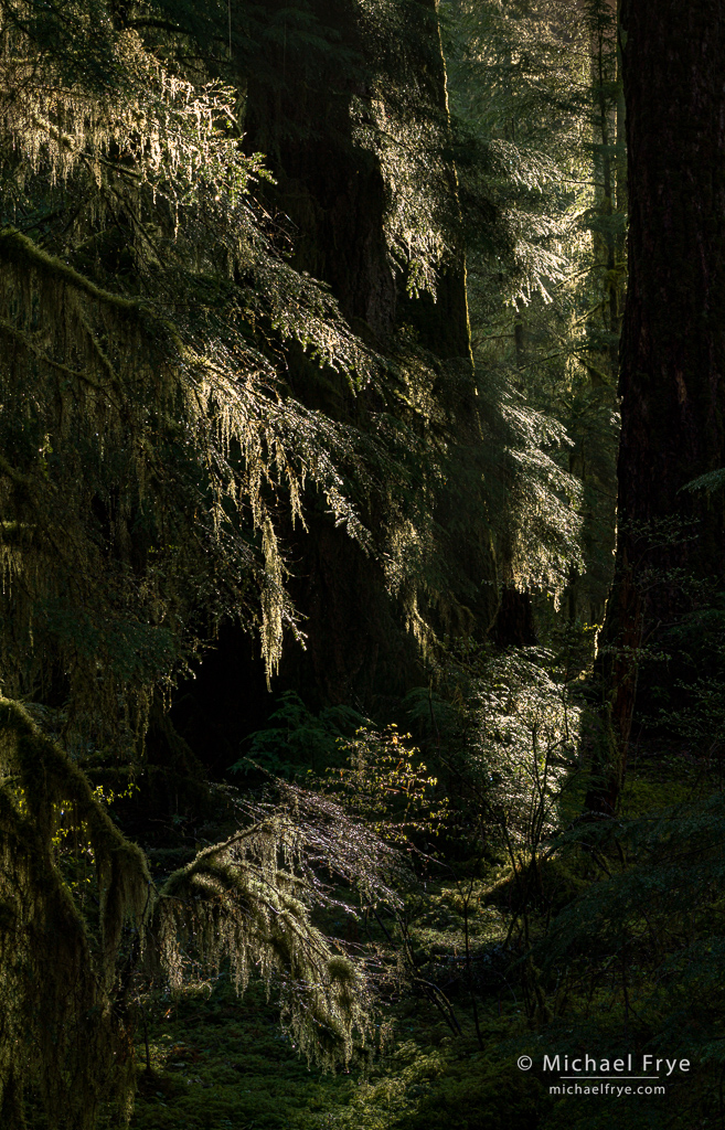 And the locations were beautiful. I hadn’t been to the Olympic Peninsula for a long time, and it was so nice to go back. The coastal beaches and sea stacks in that area are amazing, but I was especially taken with the forests. I love temperate rainforests, like the ones in the northern California redwoods, or New Zealand. But what stands out to me in the Olympic forests is all the hanging moss (it’s really lichen, but everyone calls it moss). You find some of that in the redwoods or New Zealand, but it’s especially abundant and luxurious on the Olympic Peninsula.
