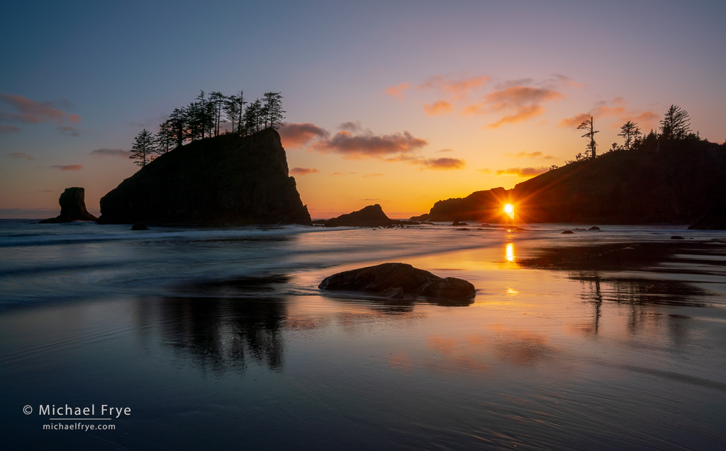 Sun setting through a natural bridge, Olympic NP, Washington. During the conference our group had fun photographing the sun setting through this natural bridge along the coast.