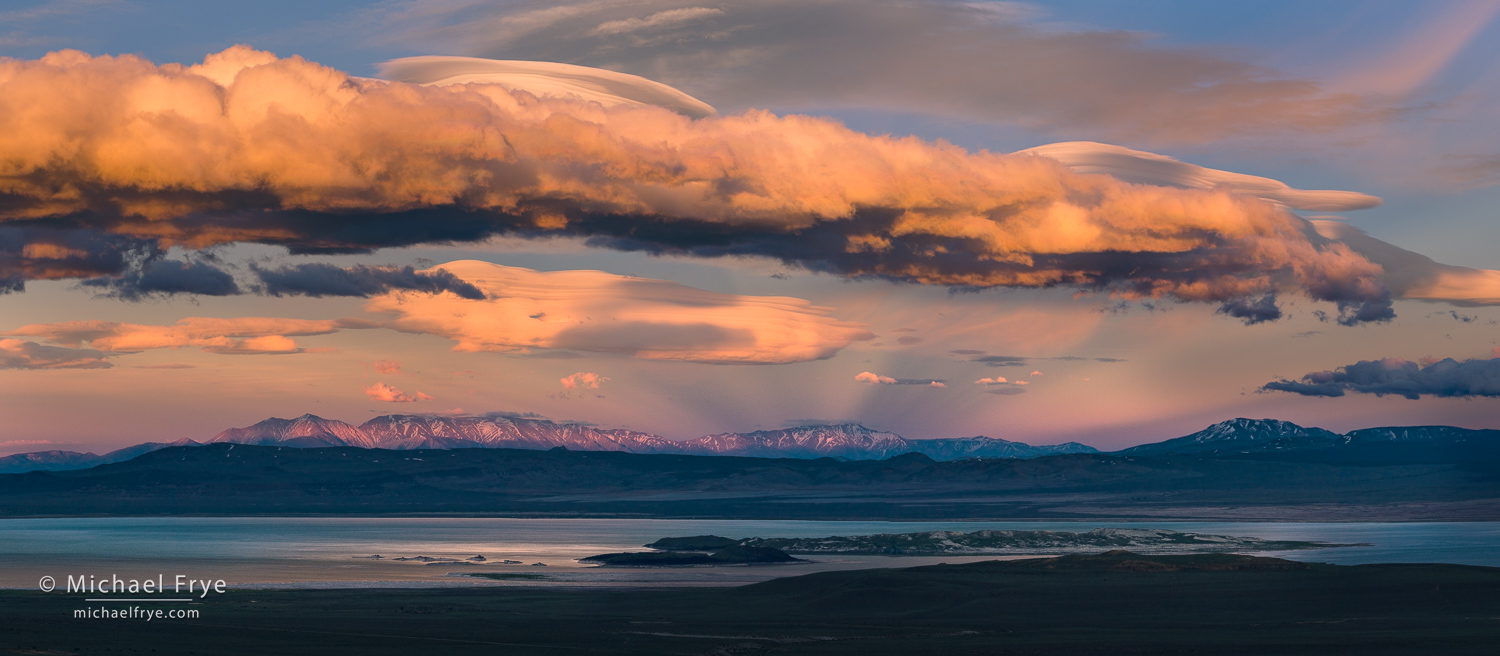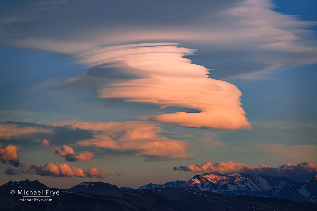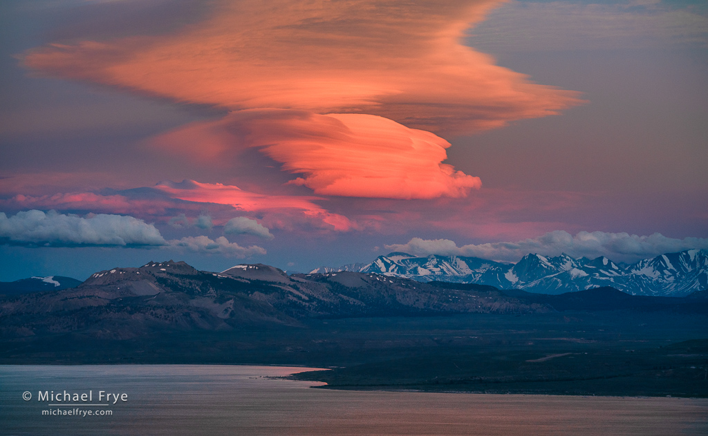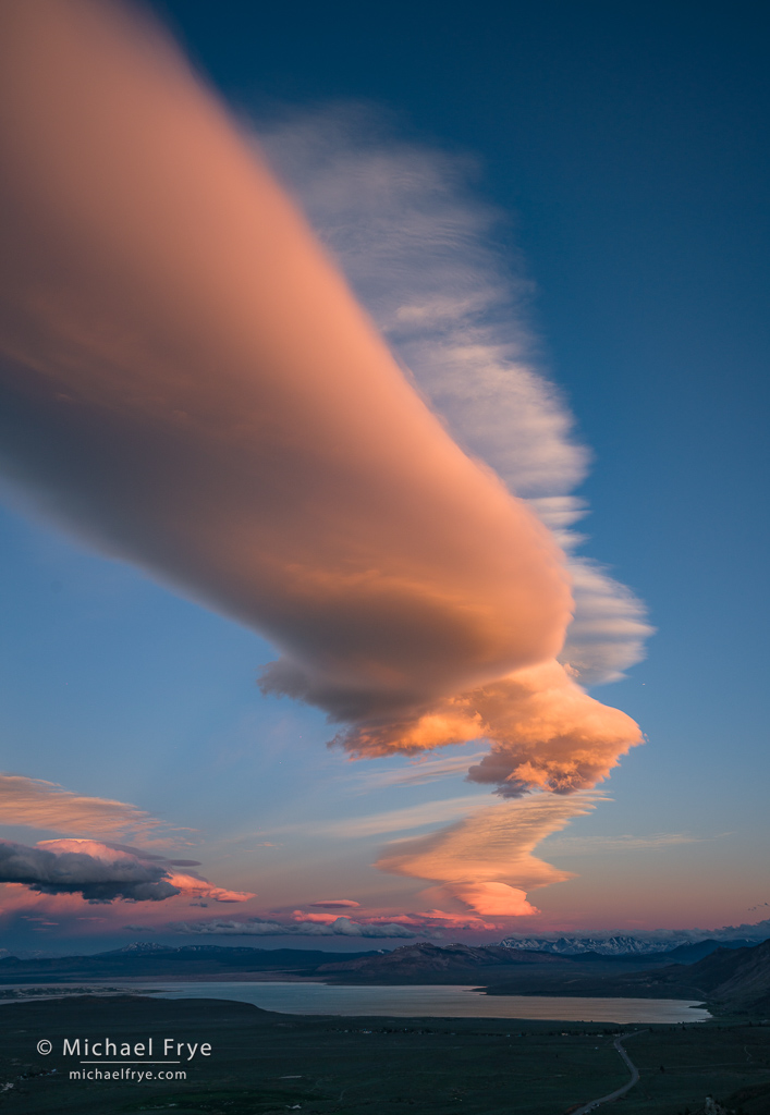 Claudia and I were in Lee Vining (on the eastern side of the Sierra near Mono Lake) recently for our Starry Skies Adventure workshop. The two days prior to the workshop were quite windy. Mornings would start out calm, but by nine or ten o’clock we’d see lenticular clouds starting to form, and we didn’t need a forecast to know it would be a windy afternoon. As the day progressed the clouds grew, and lingered until sunset, adding color to the cloud designs. On the second day (June 18th), a long “Sierra wave” formed. We could see it extending from just north of Mono Lake well to the south. People saw it as far south as Lone Pine.