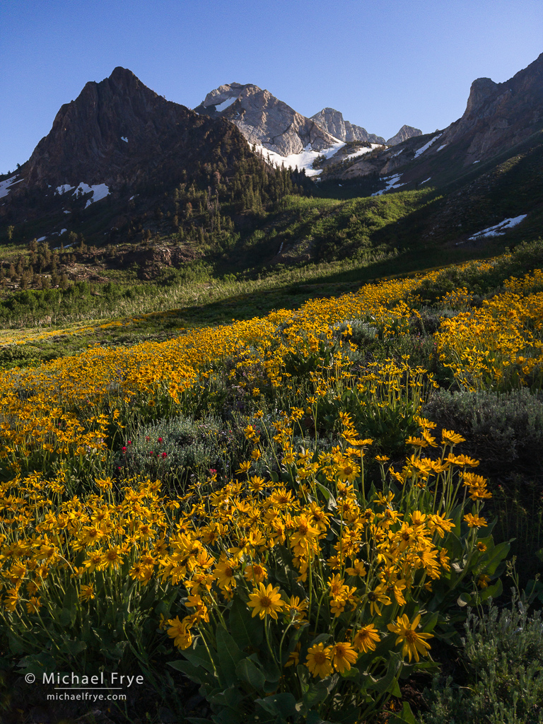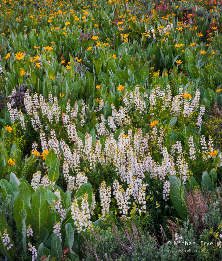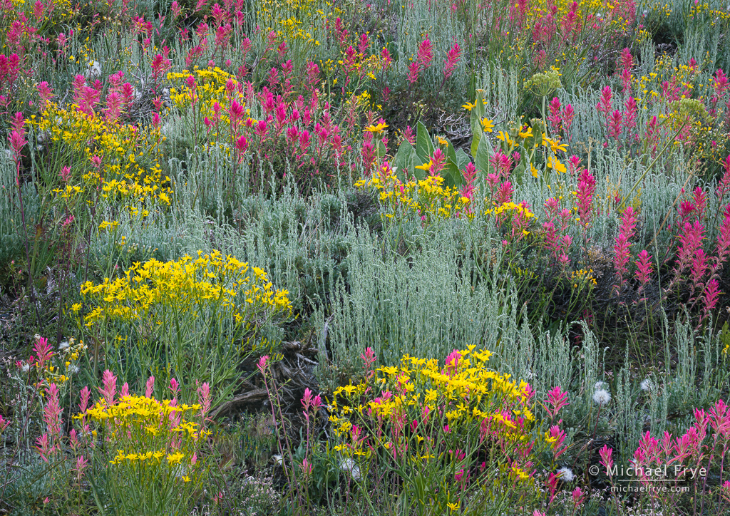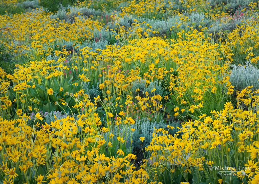 Arrowleaf balsamroot, sagebrush, and paintbrush, Inyo NF, California. Here the wind died just long enough to capture a focus-stacking sequence. 84mm, 1/15 sec. at f/16, ISO 320, three focus-stacked frames blended with Helicon Focus.