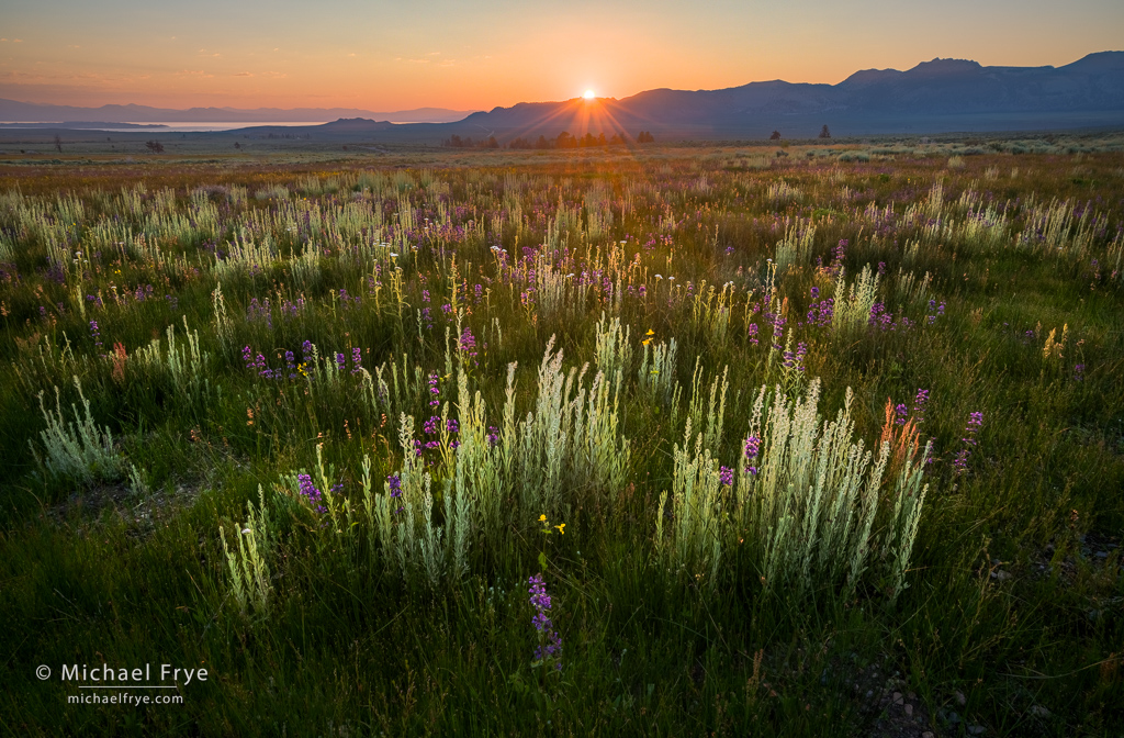 Sage and wildflowers at sunrise, eastern Sierra Nevada, California. Another high-contrast scene that required bracketing and blending exposures to get detail in highlights and shadows. 22mm, five auto-bracketed frames with shutter speeds ranging from 1/3 to 1/750 sec., f/16, ISO 400, blended with Lightroom’s HDR Merge.