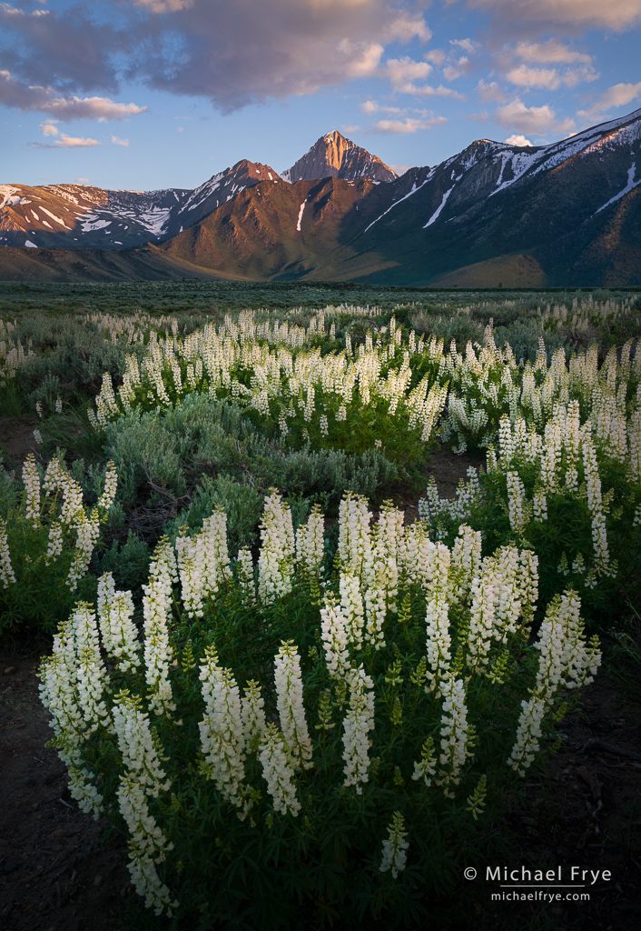White lupines and Sierra Nevada peaks, Calfornia. I’d never seen such an extensive display of white lupines before – and set below some beautiful peaks to boot. 32mm, 1/20 sec. at f/16, ISO 100.