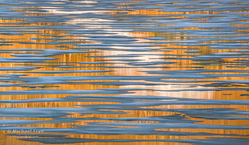 The ice was some distance across the lake, so I would need a long lens to zero in on it. Pattern photographs usually work best when you can fill the frame with the pattern, from edge to edge, and make it look as if the pattern extends beyond the frame indefinitely. I could have walked around the lake to get closer to the ice, but that wouldn’t be the right angle to get the sunlit mountainside reflected in the water.