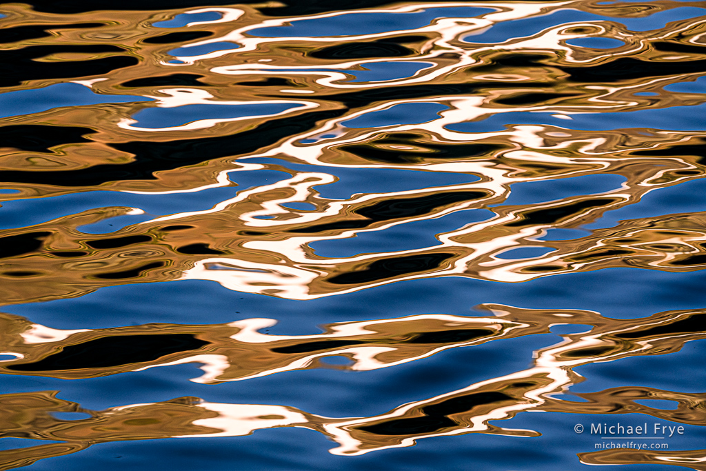 During our Range of Light workshop in July we found some striking reflections in a mountain lake. These weren’t mirror reflections, because a nearby cascade was pouring into the lake, rippling the surface of the water. But that’s actually what made the reflections so interesting. The ripples created squiggly lines and shapes in the water, as the surface reflected blue sky and late-day, golden light shining on rocks and snowbanks across the lake.