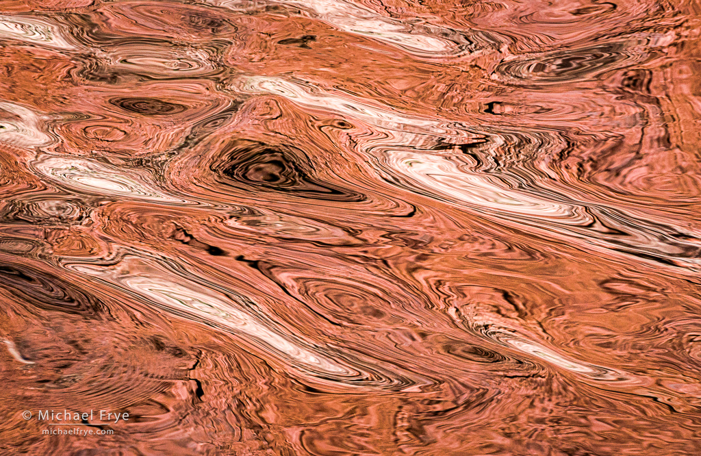 Since the ripples were moving so rapidly, the only way to catch the best moments, when the patterns were most interesting, was to fire off a lot of frames, then pick out the best ones later. I captured at least 200 frames, and picked out just two here: the one above, and the first one below. (The last image below is another water abstract made in the Grand Canyon last year.)